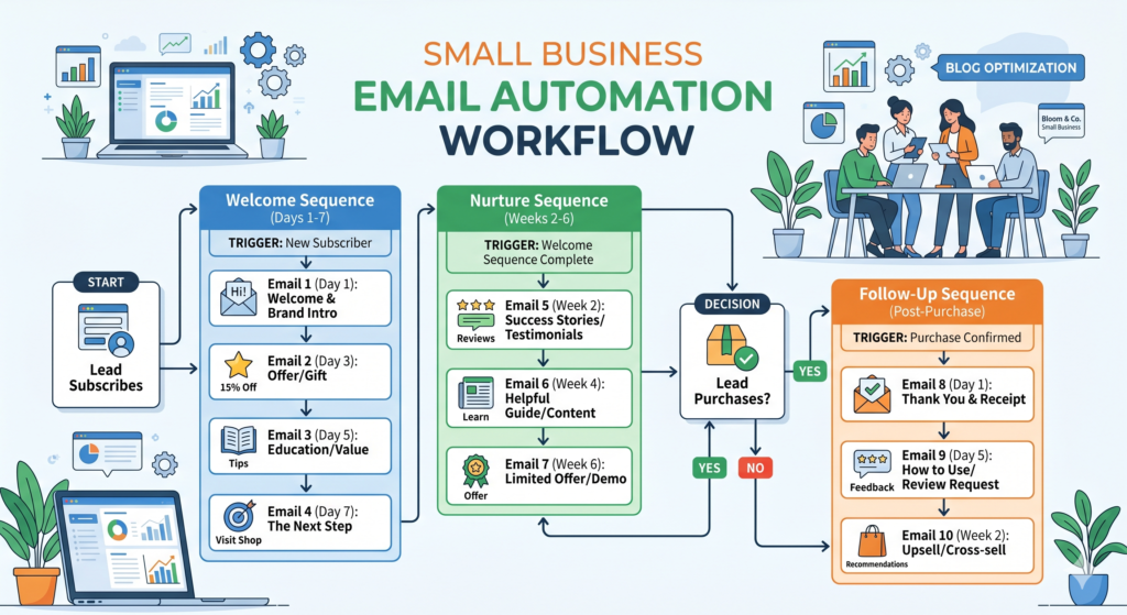 The most valuable automations for email marketing for small business are the welcome sequence, a post-purchase or post-project follow-up sequence, a re-engagement sequence for subscribers who’ve gone quiet, and a lead nurture sequence for prospects who haven’t yet hired you. Each of these runs in the background, working 24 hours a day, while you focus on running your business.
